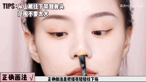 再将强调的部分变亮,用高光去提亮整体的轮廓,从视觉上缩短鼻子长度~