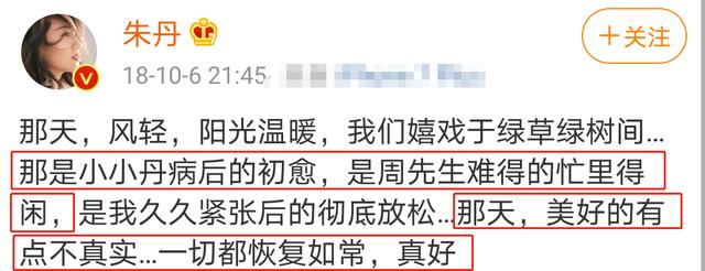 而朱丹更像是感情中的小女生,在社交平台上晒生活,表达对周一围的崇拜,是她传达爱的方式。