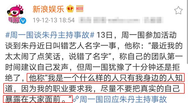仅有的几次提到妻子的话题中,周一围的言论也让人多有不适。在聊到拍戏时,周一围称朱丹的拍戏不是真正意义上的拍戏,引发朱丹粉丝的强烈不满。