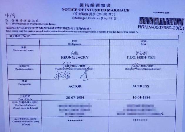 6月8日,两人第一次传出要注册结婚的消息。当时,港媒爆料称郭碧婷与向佐准备在香港正式入纸注册,并曝光了一张拟结婚通知书。从图片来看,向佐已签名登记,婚姻栏填的是未婚,而另一边的郭碧婷还未正式签名。