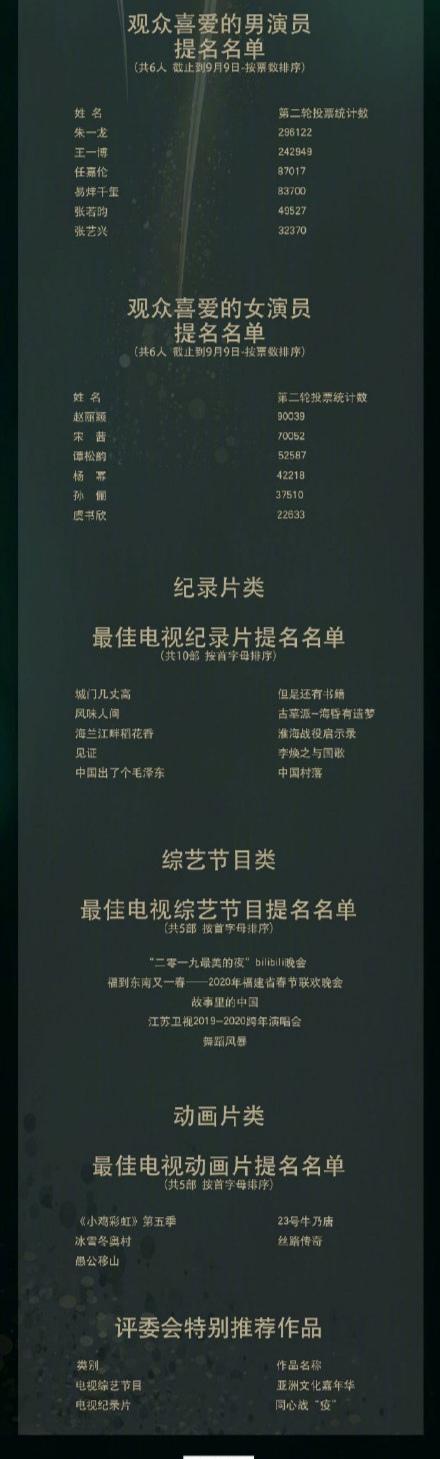 其他奖项同样竞争激烈,陈宝国、任达华、王劲松、王凯、赵波以及新人演员易烊千玺入围“最佳男演员”奖;蒋雯丽、孙俪、陶虹、童瑶、王茜华和赵丽颖将竞逐“最佳女演员”奖。演员奖之外,巴特尔、曹盾、孔笙、刘江、宋业明、吴子牛入围“最佳导演”提名;陈育新、郭靖宇、马继红、袁克平、瓜子工作室、赵琪则入围“最佳编剧”提名。