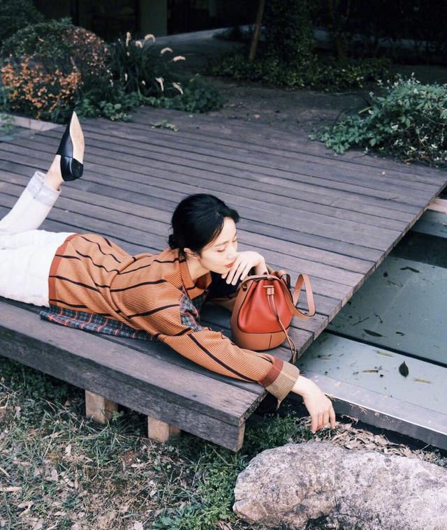 这一件衣服的正面和背面是截然不同的,背面添加的是竖条纹的元素,让这两面产生了鲜明的对比。搭配的是一条白色的休闲长裤,趴在木板上面的样子显得随意又文艺。她还选择可一个棕色的撞色水桶包进行搭配,让自己变得更加精致,也诠释出了女人味,使她看上去十分的温婉。