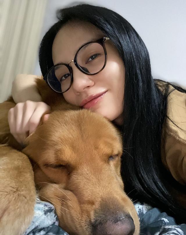 和狗狗在一起的陈妍臻放松又幸福,素颜的她皮肤饱满水润,一副黑色镜框眼镜降低了锐气,放大了生活中的温柔,让人忍不住想靠近。