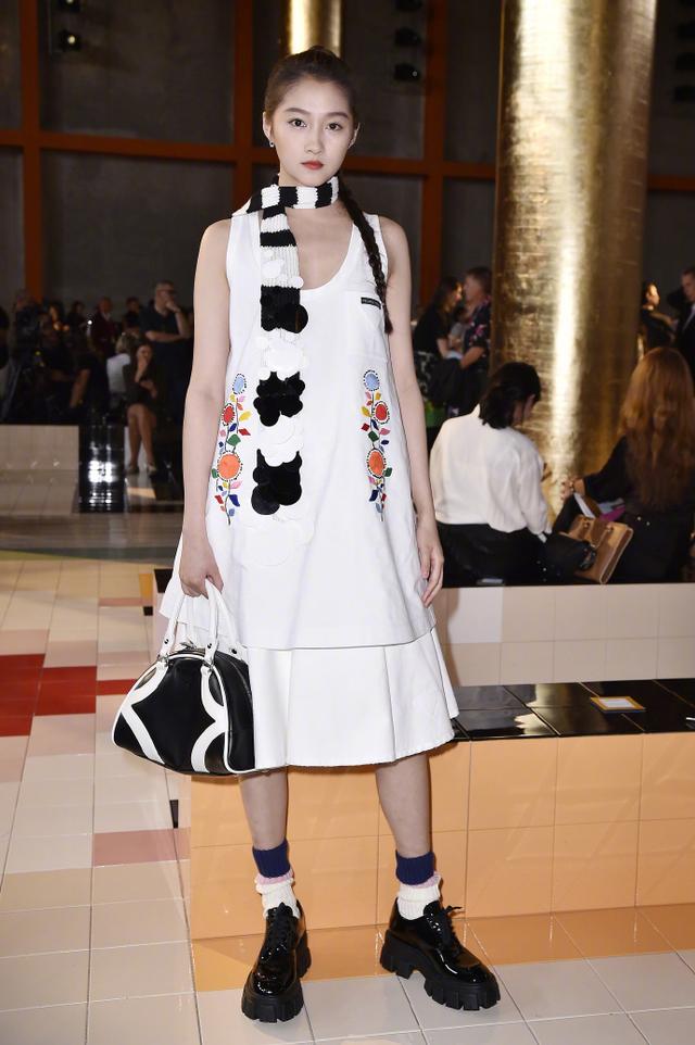这款Prada早春的白色花朵刺绣连衣裙少女感不太强,即使脚上的袜子也有些夸张。