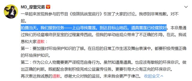 当事人刘宇宁今天中午发道歉文,为自己举动做出诚恳道歉,并表示节目中采摘的雪莲花并非实物,而是节目组提前预设道具。