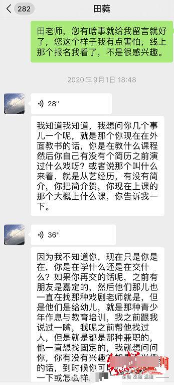 在曝光的聊天记录中显示,在事发后的这天晚上,田蕤曾在微信上询问该女生:“你喜欢我吗?”对方还问:“你喜欢和我接吻吗?”A女士先是一愣,接着回答:“不知道。”田蕤说:“这也算是一种答案。”此外,不知道是为了弥补过错还是为了示好,聊天记录中田蕤还向该女生提供了职业规划的选择,利用自身的影响力为其介绍资源。