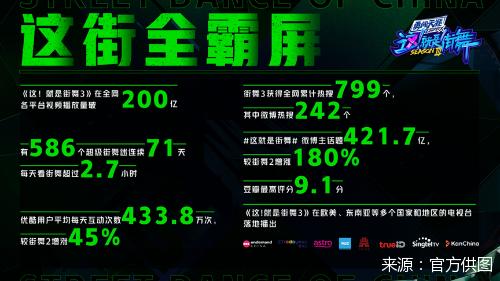 ½ØÖÁ¾öÈüǰϦ£¬¡¶½ÖÎè3¡·ÔÚÈ«Íø¸÷ƽ̨ÊÓÆµ²¥·ÅÁ¿ÒÑÍ»ÆÆ200ÒÚ£¬ÀÛ¼ÆÊÕ»ñÈ«ÍøÈÈËÑ799¸ö£¬ÆäÖÐ΢²©ÈÈËÑ242¸ö£»#Õâ¾ÍÊǽÖÎè# ΢²©Ö÷»°ÌâÔĶÁÁ¿¸ß´ï421.7ÒÚ£¬½Ï¡¶½ÖÎè2¡·ÉÏÕÇ180%£»ÓÅ¿áÓû§Æ½¾ùÿÌìµÄ»¥¶¯´ÎÊýÒ²¸ß´ï433.8Íò´Î£¬½Ï¡¶½ÖÎè2¡·ÉÏÕÇ45%¡£