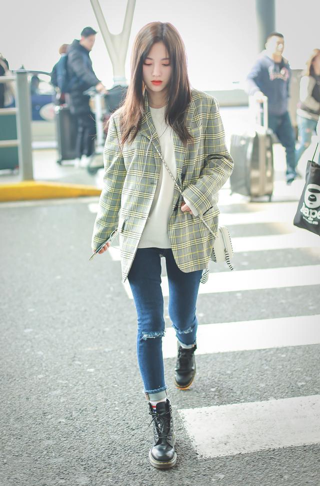 由稍大的西装和修身的牛仔裤组成的西装非常适合身材娇小的女孩,例如Ju Jingyi的灰色的格子西装与深蓝色牛仔裤搭配。直立的肩膀和西装的垂褶轮廓为穿着者带来了完全的视觉感。修身的牛仔裤,细长的腿部线条可以使苗条又高的身材排成一行。
