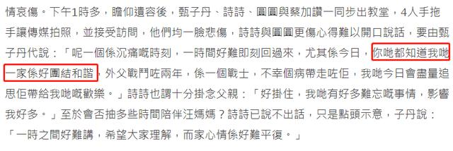 有媒体上前想要采访,汪诗诗汪圆圆悲痛到难以开口言语,甄子丹代为发言,表示这是沉痛的一刻,一家人团结和谐赶回来,岳父不幸被病痛带走,但葬礼上他们会尽量追思一些欢乐时光,希望大家理解他们难以平复的心情。