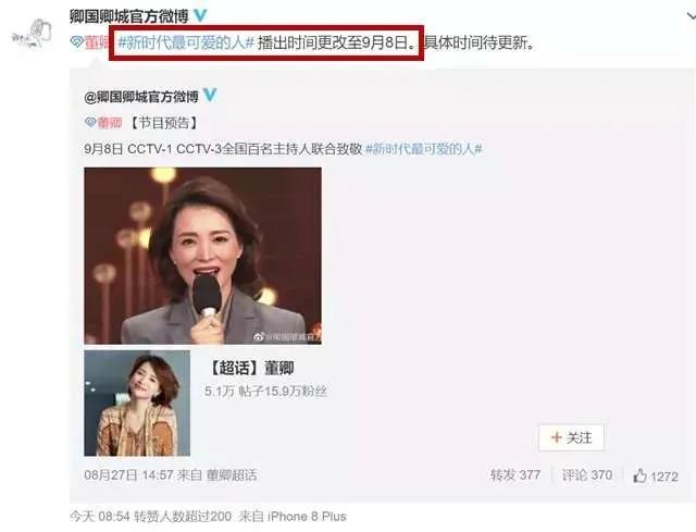 就在一天后,董卿官方就迅速发布微博宣布,董卿主持的《新时代最可爱的人》将在央视CCTV1-CCTV3联合播出。