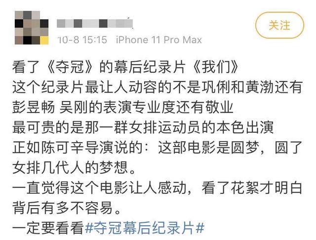 “看了纪录片才感觉到看电影忽略掉了很多小细节,想去再看一遍电影,不管是巩俐、黄渤这些演员,还是女排那些姑娘们,都太不容易了。电影呈现和幕后记录结合,才能真正感受到这部作品的珍贵。”有网友评价道。