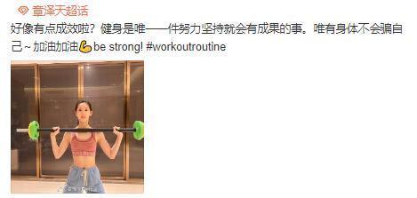 近日,“奶茶妹妹”章泽天在社交平台上晒出健身撸铁照。并配文“好像有点成效啦?健身是唯一一件努力坚持就会有成果的事。唯有身体不会骗自己,加油加油。”