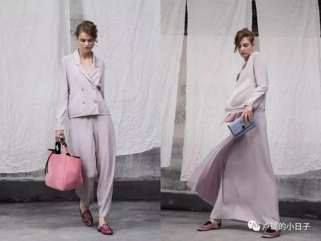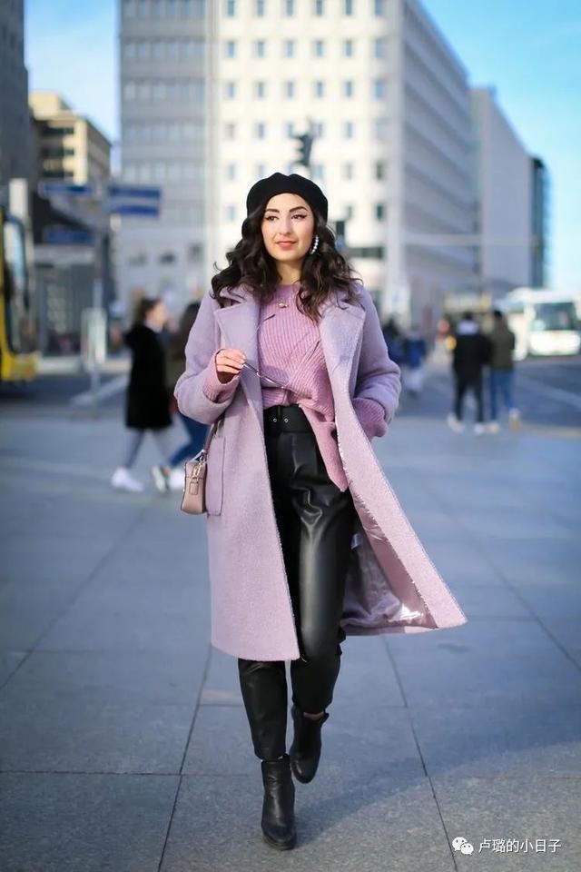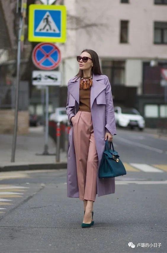 粉色紫这种温暖的颜色总是让人眼前一亮,与粉紫色做搭配的单品颜色不能复杂,尽量不要超过三个颜色。