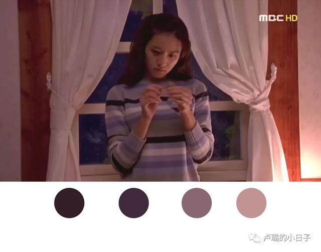 回到电影,梓希在看尚明给的礼物时,穿的这件条纹毛衣是明显的莫兰迪配色,深浅不同的蓝紫色组合在一起,十分和谐。梓希倚靠在窗边,在暖黄色的灯光里,美得像一幅油画。