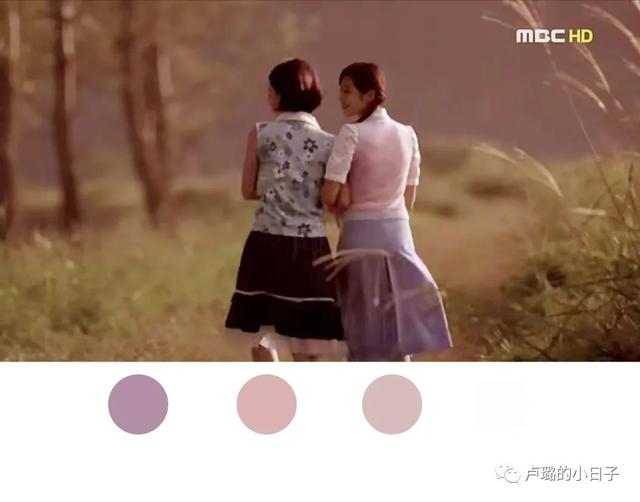 珠喜与俊和在乡下的第二次见面时穿的这身衣服,也运用到了莫兰迪色系搭配,淡紫色的裙子、淡粉色的背心、白色泡泡袖衬衫搭配在一起非常温柔、非常优雅,符合电影中的贵族大小姐形象。