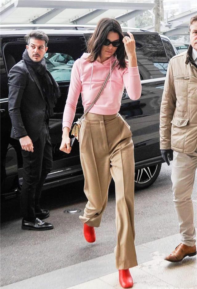 这套搭配很适合梨型身材的女生,可以完美的扬长避短。粉色的紧身卫衣刚好可以展现出纤瘦的上半身,咖色的阔腿裤把腿部的肉肉全部都藏住,还顺带拉长一把腿部线条。大红色的鞋子大胆也很“亮眼”,让你成为全场最亮的仔!