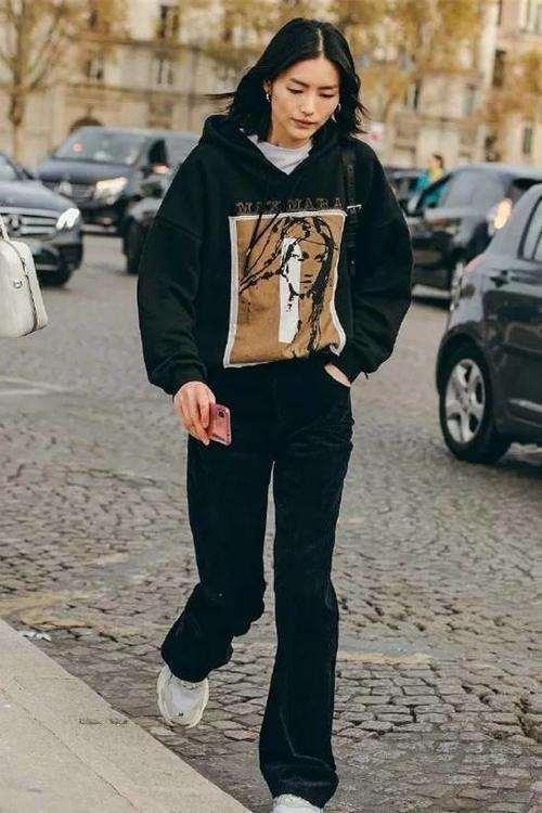 我们来看下拥有九头身的超模大表姐—刘雯,身高170+的刘雯选择了一件印花卫衣+丝绒阔腿裤,宽松的卫衣加上宽松的阔腿裤,将宽松和休闲发挥到了极致,不但没有显得邋遢,反而增加了整体的时髦度。