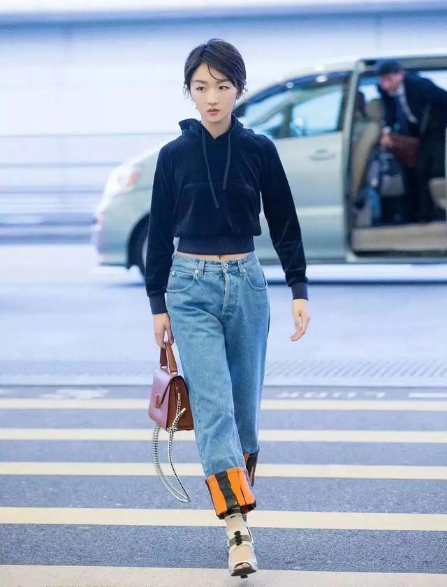 小个子的代表人物周冬雨也很爱这个穿搭,露脐的短款卫衣搭配牛仔阔腿裤,很好的改善了头身比例,让周冬雨看起来一下子增高了10cm。牛仔裤的裤脚撞色也让整个造型颇为亮眼时尚。