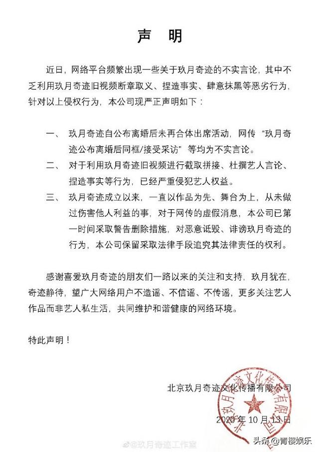 昨日10月13日凌晨,玖月奇迹工作室发布辟谣声明,对这一虚假信息做了一次详细说明,表示“玖月奇迹”组合自离婚过后,二人便再没有一同出席过任何公关场合,有关二人的同框合照,以及私下接受采访等话题,皆为不实言论,并网上晒出的二人同框视频,实为玖月奇迹早年间的旧视频,并在被他人拼接杜撰、捏造事实后,上传到各家网站。