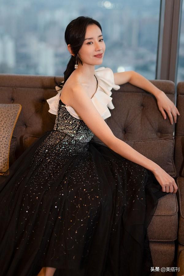 除了小亮钻,裙子还拼接看了白色荷叶边,荷叶边还是多层设计,甜美有层次感,荷叶边优雅神秘的星空裙增添了几分俏皮感。荷叶边设计成了单肩,露出了一半香肩和锁骨,无袖让整个玉臂也露出来了。除了荷叶边,胸口和腰部紧紧的贴着皮肤,最大程度上修饰出了董洁玲珑有致的身段,40岁的董洁身材保持得相当好,瘦而不柴,小蛮腰不输年轻女艺人。