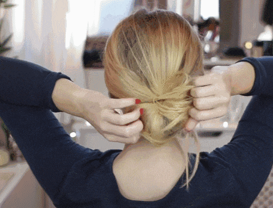 step2:将发尾向左边反,包住所有头发,包成一个发髻。然后用同一条皮筋,将发髻绑好就可以了。