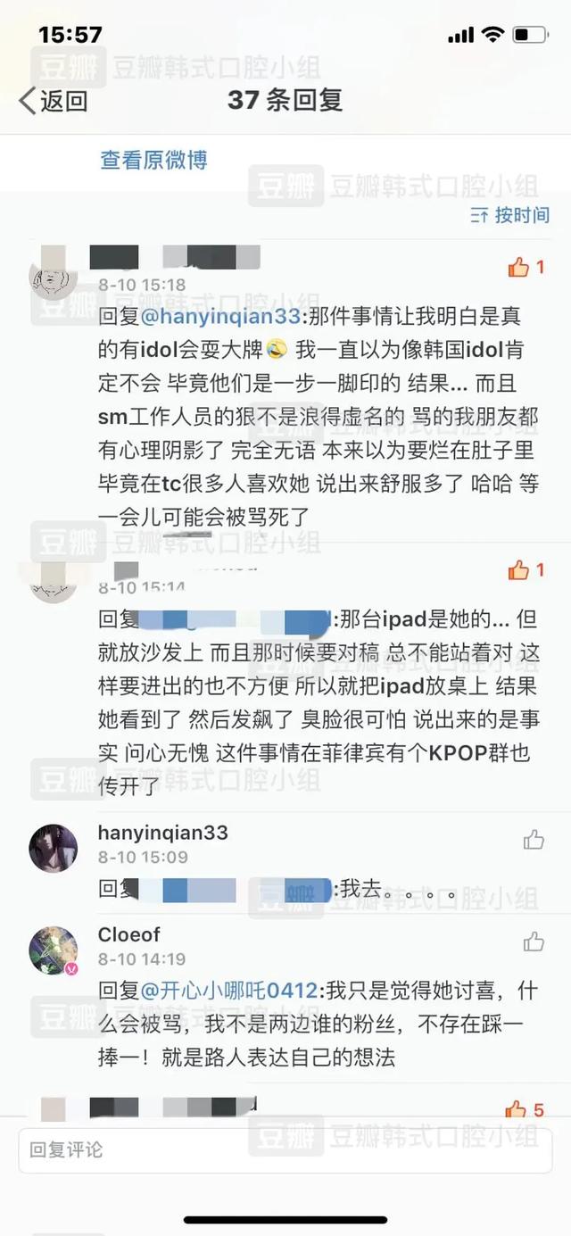其实之前就有Irene耍大牌的新闻,只因为iPad被移动了就生气发火,还让工作人员一起去骂人,自己的iPad能放在沙发上,翻译却不配坐在沙发上。只能说sm公司的态度也很有问题,艺人嘴毒工作人员不仅不管还跟着一起嘴毒,sm看人品看来也是洗脑包之一了,“sm真的要完蛋了吧”。