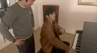 只见郎朗故作笨拙地弹了一首曲子,时不时瞟一眼站在旁边指导的周董。