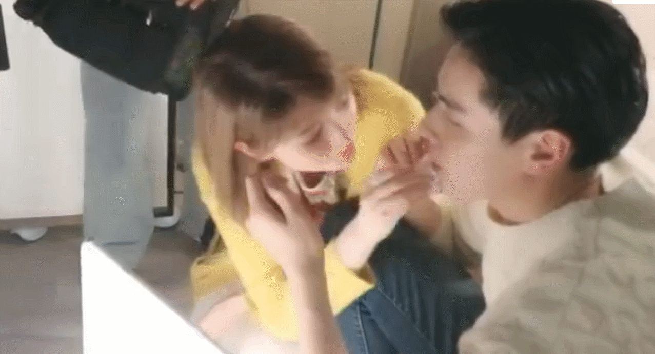 可能是导演喊了“卡”,前一秒还在深情拥吻的两人瞬间破功,乔欣害羞地直接将头埋在了胡一天肩上,胡一天似乎也有点不知所措,只能满脸羞涩地笑着。乔欣趴在胡一天肩上缓了一会儿后,又双手捂着脸蹲在了一旁,胡一天则是用卫生纸静静擦着嘴。