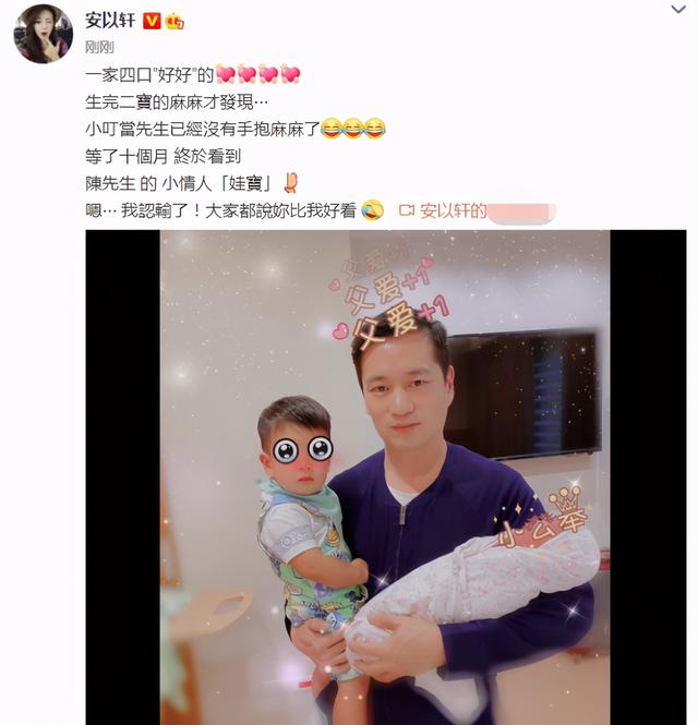 10月29日,安以轩分享二胎产女喜讯,她写道:“一家四口'好好'的,生完二宝的麻麻才发现,小叮当先生已经没有手抱麻麻了。等了十个月终于看到陈先生的小情人‘娃宝’。嗯? 我认输了!大家都说你比我好看”。