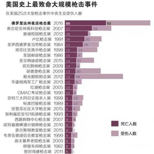 2018年全年,美国共发生涉枪案件57103件,导致14717人死亡、28172人受伤,其中未成年人死伤3502人。2017年,发生逾6.1万起枪击案,造成伤亡人数4.65万多,其中15488人死亡、3.1万人受伤。