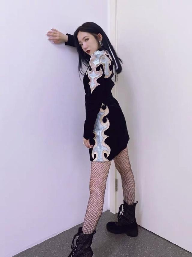 但是在舞台下,这套衣服对于孟美岐也没有那么友好。虽然是黑色的连衣裙,因为在两侧加入了亮色印花,在视觉上就会显得膨胀,会有点显胖,下图中孟美岐的侧后方照看上去就有点壮实。