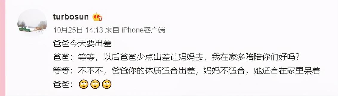 演员孙俪在微博记录说,邓超当天要出差,于是邓超跟儿子等等说:“等等,以后爸爸少点出差让妈妈去,我在家多陪陪你们好吗?”