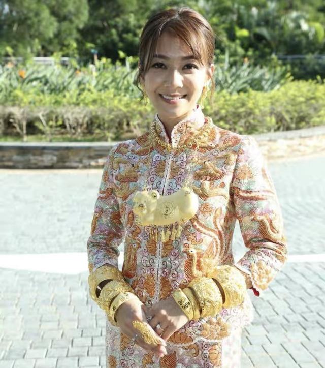 除了挂着醒目的金猪牌之外,何雁诗手臂上戴着5对金手镯,手上戴着3个钻戒和1个凤凰花纹的金戒指,贵气逼人。
