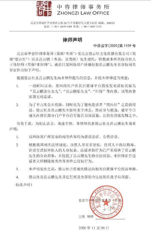 但是随着网络上各种“岳云鹏私生女”,“岳云鹏亲生女儿”的谣言太多,于是在11月9日,德云社方面发出了“律师声明”,并表示压根没有“私生女”一说,如果当事人继续造谣的话,将进行法律程序来维护岳云鹏的个人权利。
