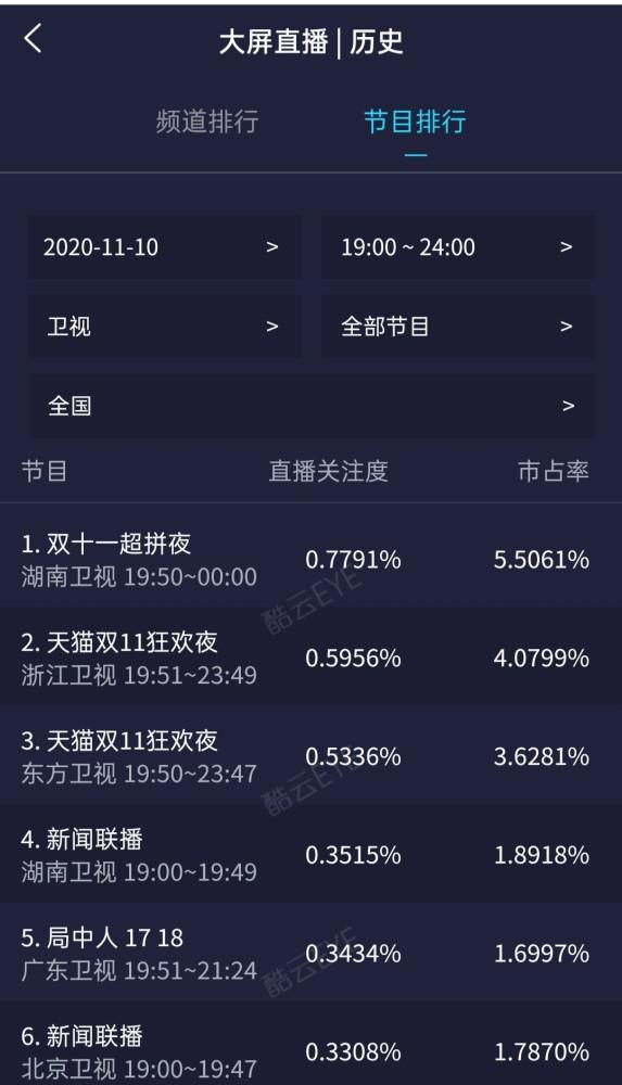 霸屏微博热搜外,市场对这场晚会狂欢直接关注有多少呢?酷云数据显示,当晚湖南卫视的双十一超拼夜收视领跑全场,直播关注度0.7%,紧随其后的是东方卫视和浙江卫视联手的天猫双11狂欢夜,收视分别为0.6%和0.5%,北京卫视的苏宁易购11.11超级秀和江苏卫视的京东双十一超级夜收视仅为0.2%和0.1%。