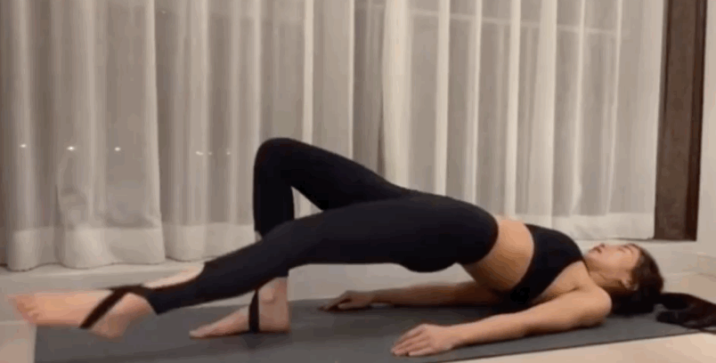 臀桥式,腹部收紧不塌腰,髋、膝、肩在一条直线上,单腿曲膝支撑,另一条腿伸直勾脚尖,吸气下放,呼气抬起来双膝在一条直线上。