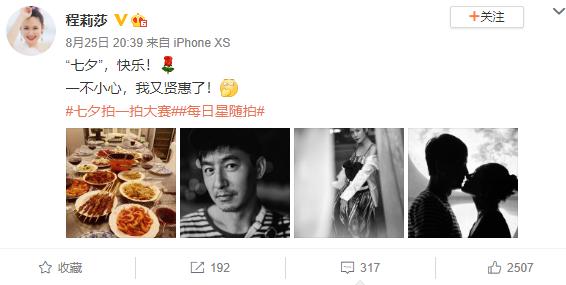 今年七夕,程莎莉还亲自下厨准备大餐,在社交平台上晒出和老公郭晓东的亲密合照,大撒狗粮。图中两人鼻对着鼻,下巴抵着下巴,在月下相会,十分浪漫。