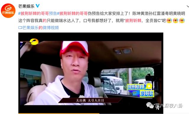 那时候有传言要出男版《披荆斩棘的哥哥》,芒果也很会,就做了个伪预告出来,名单就是来自网友的推选,陈坤啦、黄渤啦、潘粤明、黄晓明啦。