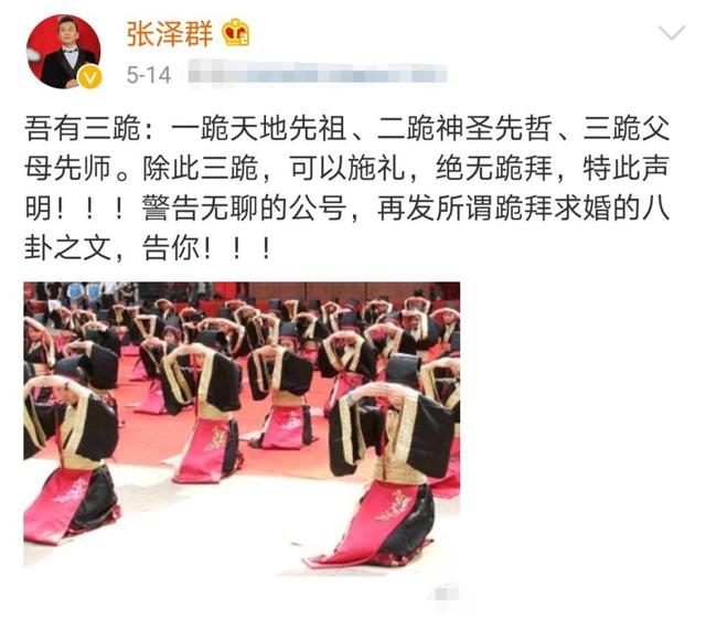 张泽群一直不愿公开自己的私生活,对于之前网上谣传的"三跪求婚董卿"事件也给与强硬回应称:只跪天地先组、神圣先哲、父母恩师,再发此类跪拜求婚文章,告你。