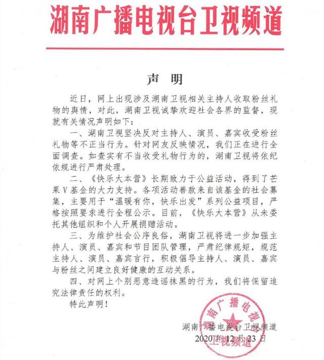 12月23日,湖南卫视在微博上发表声明表示,坚决反对主持人、演员、嘉宾收受粉丝礼物的不当行为,并将进行全面调查。如查实有不当收受礼物行为的,将依纪依规进行严肃处理。