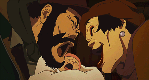 今敏在创作时,故意让这三个人穿上红黄蓝三原色,看上去像一个古怪的“三口之家”:任性的“女儿”,不靠谱的“爸爸”,家庭顶梁柱和主心骨的“妈妈”。