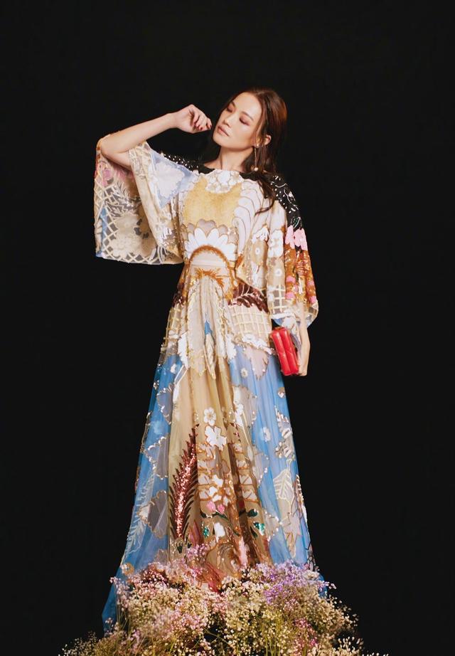 宽松的裙子设计加上满裙身的印花图案,让舒淇多了不少的田园度假风,小一字肩的设计搭配肥大的袖口,也让舒淇的身材看上去纤细了很多,高腰的设计虽然没有很好的贴合腰部,但是也做到了一定的修饰效果,搭配超长的裙摆,更让整个人的优雅被完美的展现了出来。