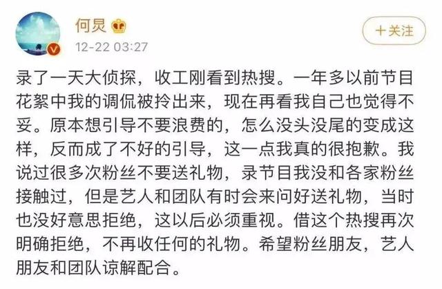 而随着话题热度越来越高,12月22日凌晨3点左右,何炅发文回应此事,他表示,之前他在节目中的原意是引导大家不要浪费,最后反而成了不好的引导,他对此感到很抱歉。如今借此机会再次强调,不再收任何礼物,希望粉丝、艺人跟团队能够谅解配合。