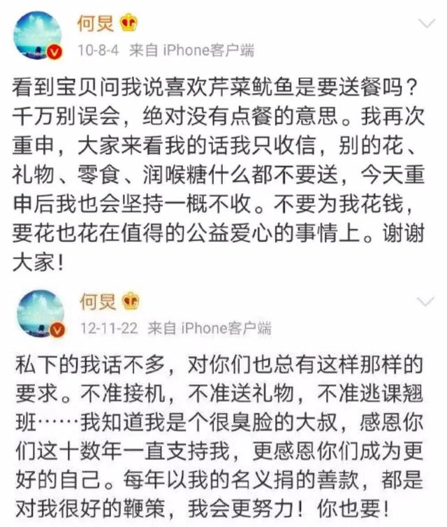 之前何炅多次在公开场合表示让粉丝别送他礼物,大家来看他的话他只收信,别的花、礼物、零食、润喉糖什么都不要送,不要为他花钱。
