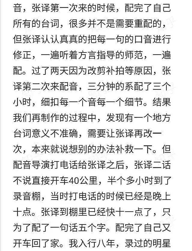 据这位网友说,张译第一次去就配完了自己的全部戏份,而且很多地方导演都认可了。但他为了让自己戏中的“方言”更标准,就一边听着方言指导的示范,一边自我纠正。